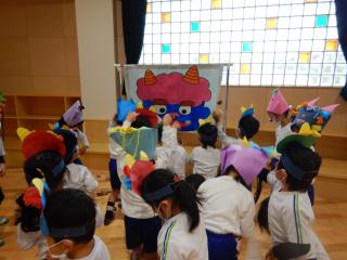 ホーム 節分 節分 2020年02月14日 延期されていた節分の会を行いました。 先生達のペープサートを見た後、泣き虫鬼や怒りんぼ鬼などの絵に新聞紙の玉を投げて、 自分の中にいる悪い鬼を退治しました。 その後入ってきた鬼にも玉を投げて、鬼はあっという間に逃げていきました。