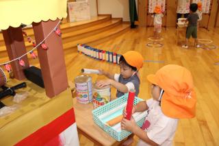 みんなの“やりたい”が詰まったお店屋さんや夏の風物詩…。ホールに集めて2、3、4、5歳児で遊んでいます。