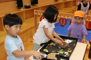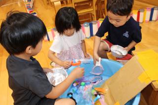 年長児は「本物っぽくしたい」「水が必要だね」「水に浮く物って何だろう」と実験を開始。水に強い物を発見しながら金魚制作に取り組んでいます。