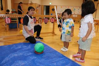 年中児は「夏ってスイカ割やるよね」「割れたらみんなで食べたい」「中身(赤い部分)があった方がいいよ」などとイメージがどんどん膨らみました。