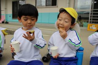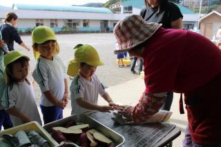 そんな大切なサツマイモを使って焼イモ作りに挑戦しました。今回は修善寺シニアクラブ(地域)の方々にも協力していただき、自分達でサツマイモを洗い、新聞紙やアルミホイルで包み、年長児はトングを使ってサツマイモを火種の中に入れました。「まだかな~あと1分?」と待ちわびている姿がとっても可愛かったです。出来上がったホカホカのサツマイモを見て「いい匂い過ぎる」「これは美味しい匂いだね」と期待に胸を躍らせ、食べると「やっぱりおいしい」「もっと食べたい」と、とびきりの笑顔が見られました。