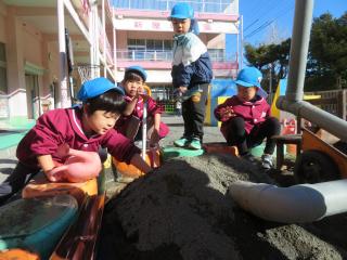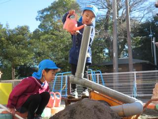 工事現場作りに夢中です。山を作って、樋をいろいろな方向で繋げて考え、協力して作る姿が見られました。