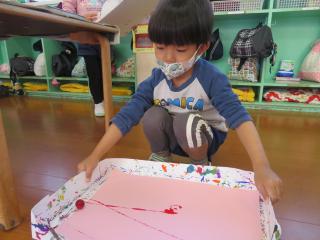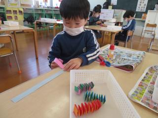 縦と横で交互に折るのは初めは「どっち折る?」と言っていたけど、繰り返し折っていくとだんだん覚えてきて、自分でどんどん作っている様子でした。