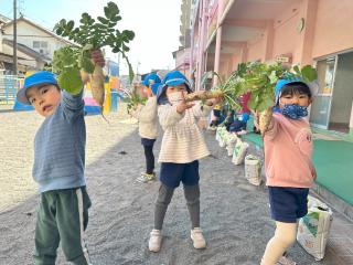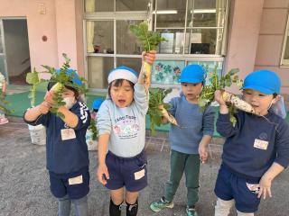 今回は一人一個、毎日水をあげて大切に育ててきた大根が大きく育ち、収穫をしました。