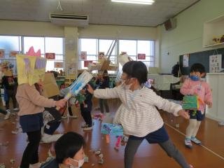 「鬼はーそと!福はーうち!」と新聞豆を力いっぱい投げていました。