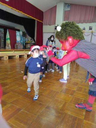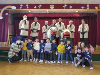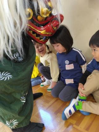 お楽しみに獅子舞が来てくれました。カツカツ鳴る獅子舞の歯の音に