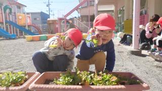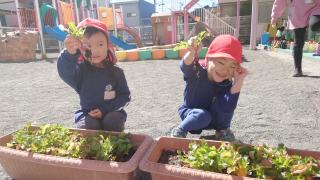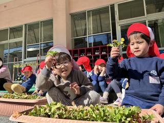 • みんなで種をまいて育てたラディッシュが大きくなりました。