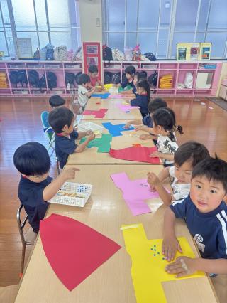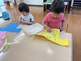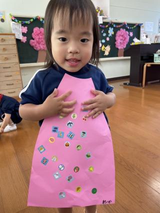 絵本『わたしのワンピース』を読んだ後、皆でオリジナルの洋服を作ったよ。好きな服にシールをペタペタ。素敵な洋服が出来たね♪