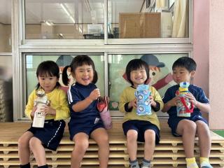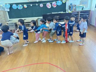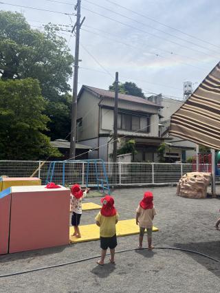 鯉のぼり行進をしたよ♪手作りの鯉のぼりを頭に付けて運動場で沢山遊んだね。