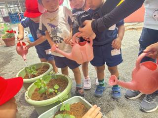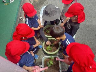 きゅうりとオクラの苗を植えたよ。まずは土のお布団を皆でフカフカに。