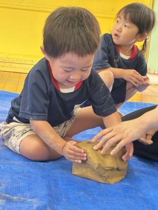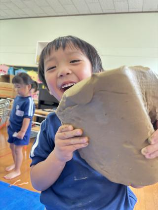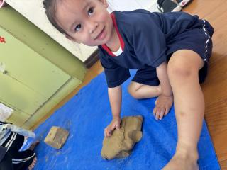 はな組さん、初めての土粘土。とっても大きな粘土をヨイショ~!