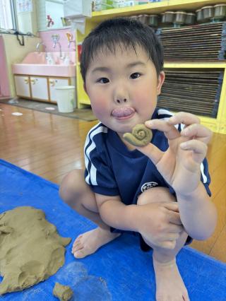 「みてみて、カタツムリ」と言って、工夫して作った作品を見せに来てくれたよ。