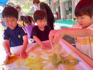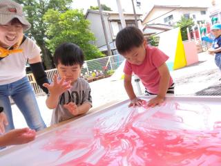 初めてのフィンガーペインティング。片栗粉、水、お湯で出来たスライム。