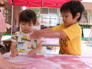 ビヨーンと伸びる黄色いスライム。「チーズみたい!」と、楽しそう♪