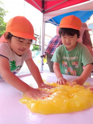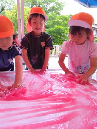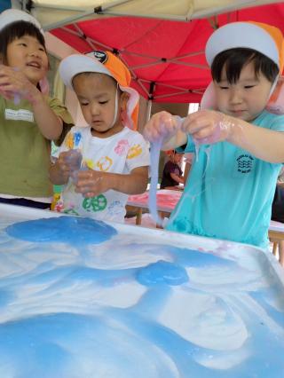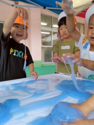 • 両手を大きく広げてみたり、お絵かきしたり、色を混ぜて新しい色を作ってみたりと色々な遊びをしていたね!体にいっぱいつけて全力で遊んだね!