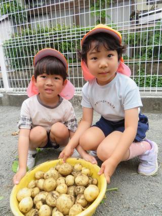 • 幼稚園に帰って来て、米袋で育てた自分たちのじゃがいもも収穫しました。