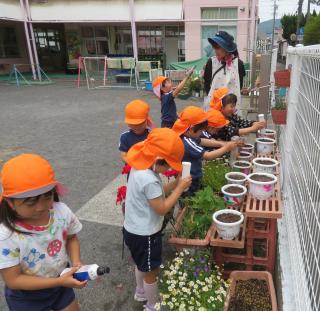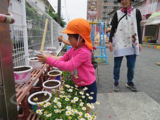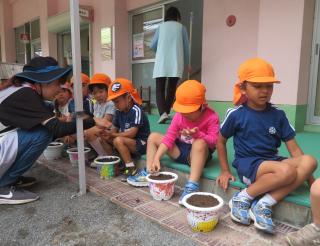 • 1人1個自分の植木鉢にヒマワリを植えました。