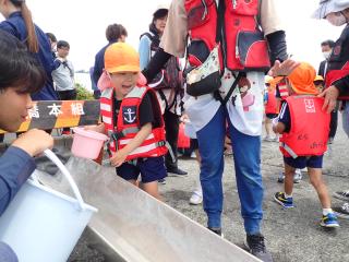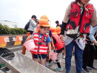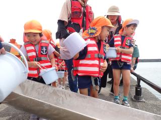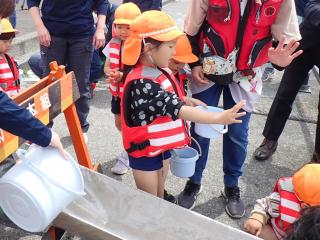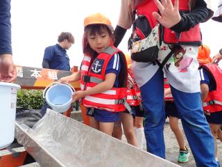 • 1人ずつバケツに入れてもらうと放流が始まりました。