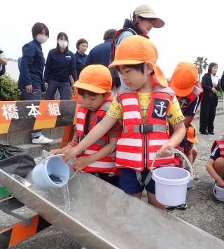 大きな樋を流れるのはあっという間で「あ!もう海に行っちゃった!!」「元気でね~!」と泳いでいくまで見守っていました。