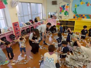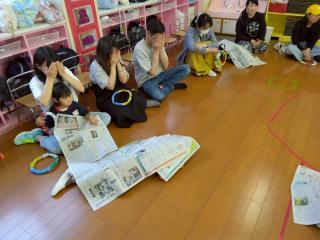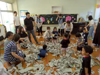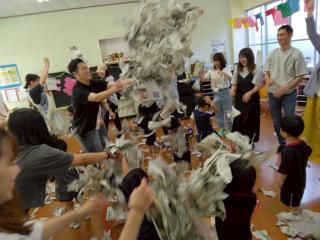 最後に皆で新聞ビリビリ。