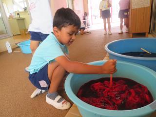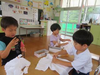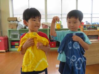 いよいよ楽しみにしていたTシャツ作り!まずは輪ゴムで模様を作りました。輪ゴム止めが上手になってきたね!