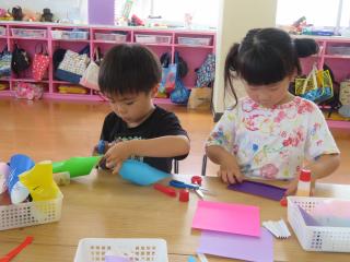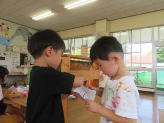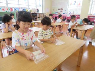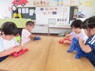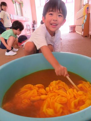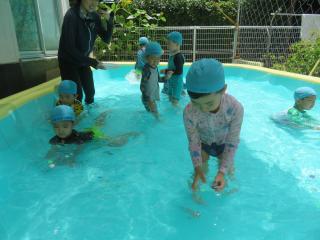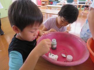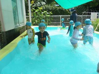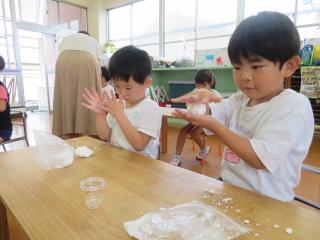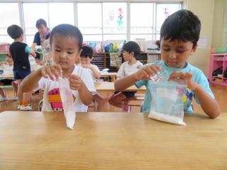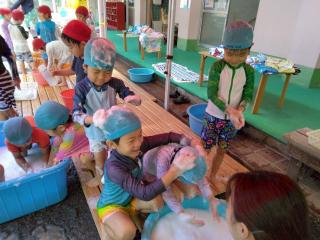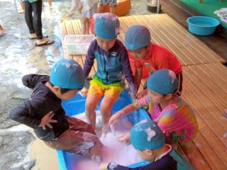 • 「はい!ソフトクリーム~」と頭にのせたり、小さなたらいにみんなでぎゅうぎゅう詰めになって入ったりととても楽しんでいる様子でした。また遊んでいこうね!