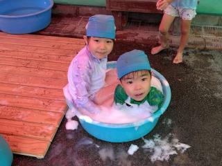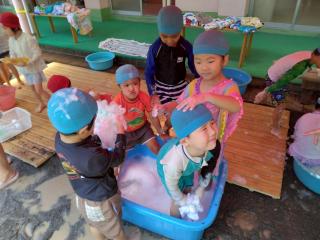 プール以外に泡でも遊んでいます。みんなでゴシゴシ…たっぷり泡ができました。