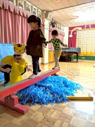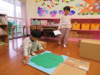 木と同じくらいの高さまで積めるかな?倒れないようにしっかり支えていたね。