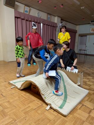 にわとりさんが丘を越えられないからみんなで力を合わせて押して、渡ることができたね!