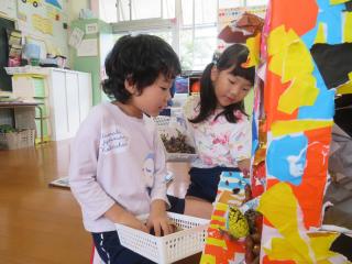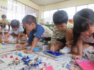 次はみんなで拾ったどんぐりや葉っぱに色を付けてみました。