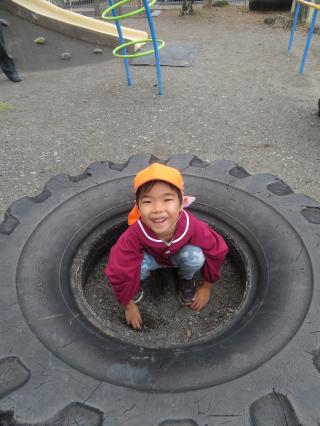 僕もすっぽり入ってしまうくらいの大きなタイヤを見つけました。