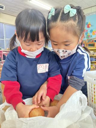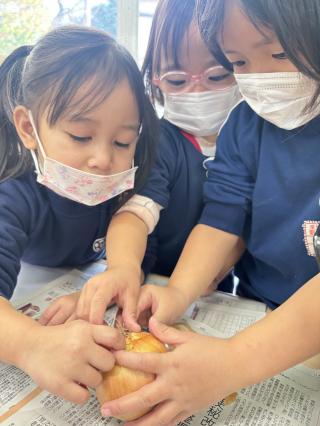 まずは皆で協力して玉ねぎの皮をむいていきます。 -