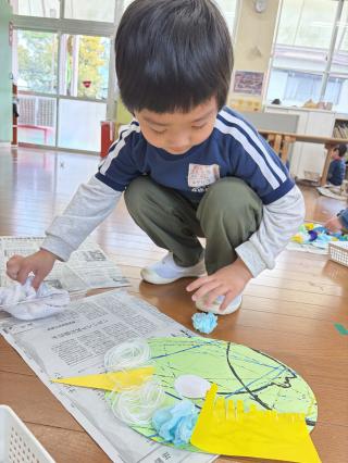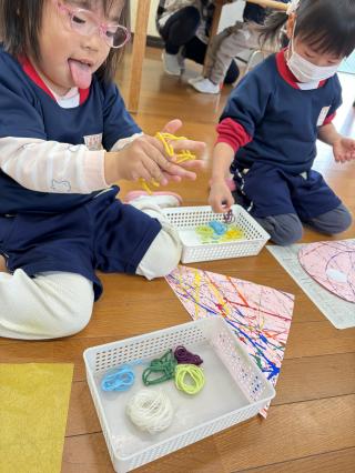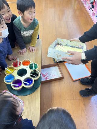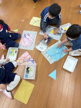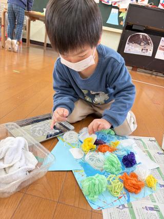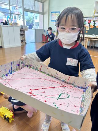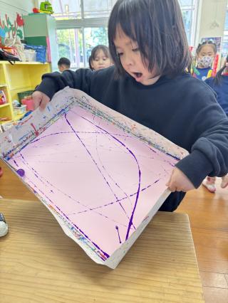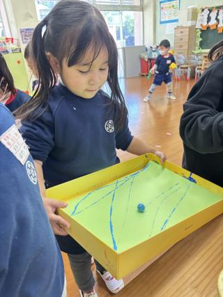 絵の具にビー玉を浸して、コロコロ転がすと「道ができた‼」と、大喜び。 -