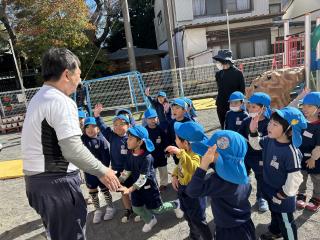 「おにをやりたいひと?」の声掛けに手を挙げる子どもたち。何人鬼になれるかな? -