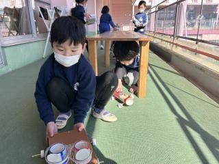 廃材を使っていろんなクルマを制作しました。タイヤはなんとペットボトルのふた!自分の作ったが走ることに子どもたちは大喜び♪
