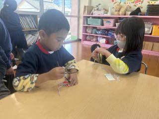 子どもたちは、木の枝に毛糸を巻いてどんな形ができるか真剣に取り組んでいました。 -