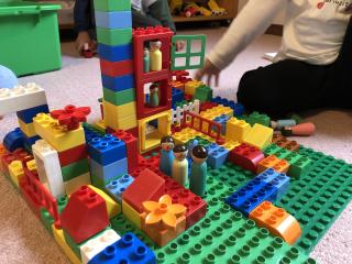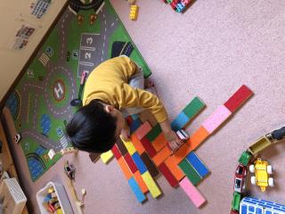 最近、ブロックで遊ぶのが大好きな子ども達。夢中になって遊ぶ中で大きさを揃えたり色を合わせたりと綺麗に並べてとても素敵な遊びになっていて、子ども達の色彩感覚って素敵だな。と思う時間でした。また、組み立ていく中で「お家!」「ここがパパの部屋」など家族の話をすることも多くなりました。遊びの中で、目で見て感じるもの、友達との関わりで育つ社会性。1つの遊びの中から様々なことを感じることができますね。