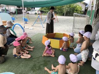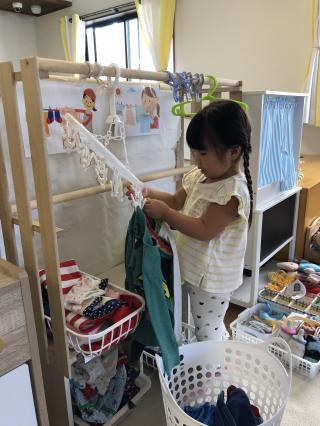 2歳児は、ワニの真似をして泳いでみたり、芝生の上で水を遠くまで運んだりと全身を使って遊ぶことができました。また、布を使って洗濯ごっこをすると、濡れた布を絞ることが難しかったり、広げて干すことが難しかったけれど、みんなお母さんになった気分で笑顔いっぱいでした。様々な経験ができた夏になりました。