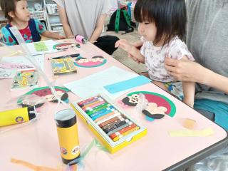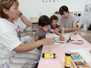 ペーパーの芯を使った提灯にシールで飾りつけをしたり、