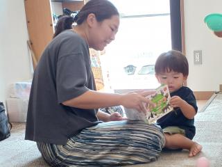 親子で持ってぬいぐるみを乗せて、ユラユラ揺らしながら『かごかご』を歌ったり、他にも膝に乗って『うしぬぱん』