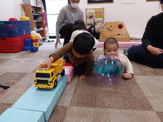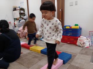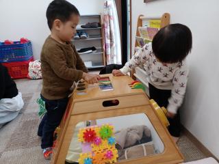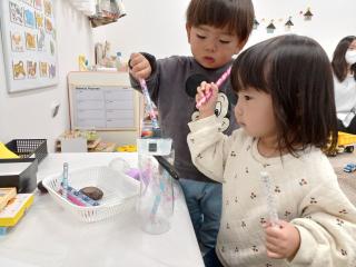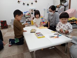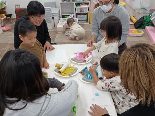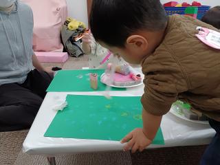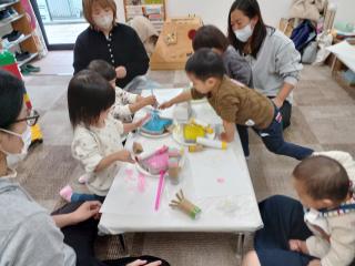 手のひらに絵の具を塗ってペタペタしてみたり、指でスタンプしてみたりと思い思いに遊んでいました