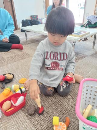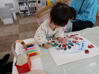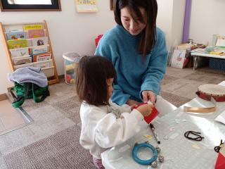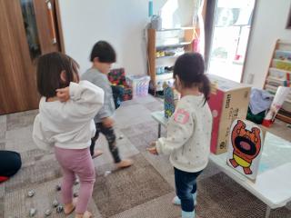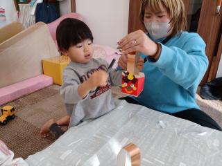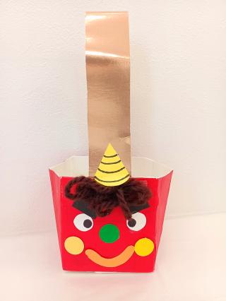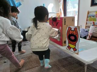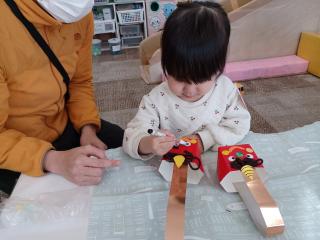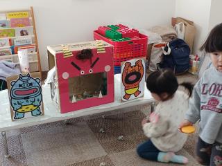 2月3日 鬼のバックを作ろう♪ 今日は、節分ということで牛乳パックを使った「鬼の豆入れバック」を作りました お母さんと楽しそうにお話しながら毛糸で髪の毛をつけたり、丸シールで目や鼻、口をつけていきました 他にも鬼の的あてゲームをしたり、鬼のパンツを当てるゲーム遊びあそびもしました 「なにをいれようかな?」っとできあがったバックをとても嬉しそうに持って帰ってくれました 鬼のお顔作ろう♪ ステキなバックできたね あとは、おめめを描いてできあがり! ここに鼻のシールを貼ろうっと 「おにわ~そと!」と元気いっぱい 新聞紙を丸めた豆をおもいっきり鬼に向かって投げました そっと優しく置いているお友達もいてかわいかったです♡ 力いっぱい鬼にぶつけよう かわいい鬼さんたちの登場♪ お絵描きあそびも楽しかったね ハンバーグにマヨネーズをかけてみよう できあがった鬼のバックです