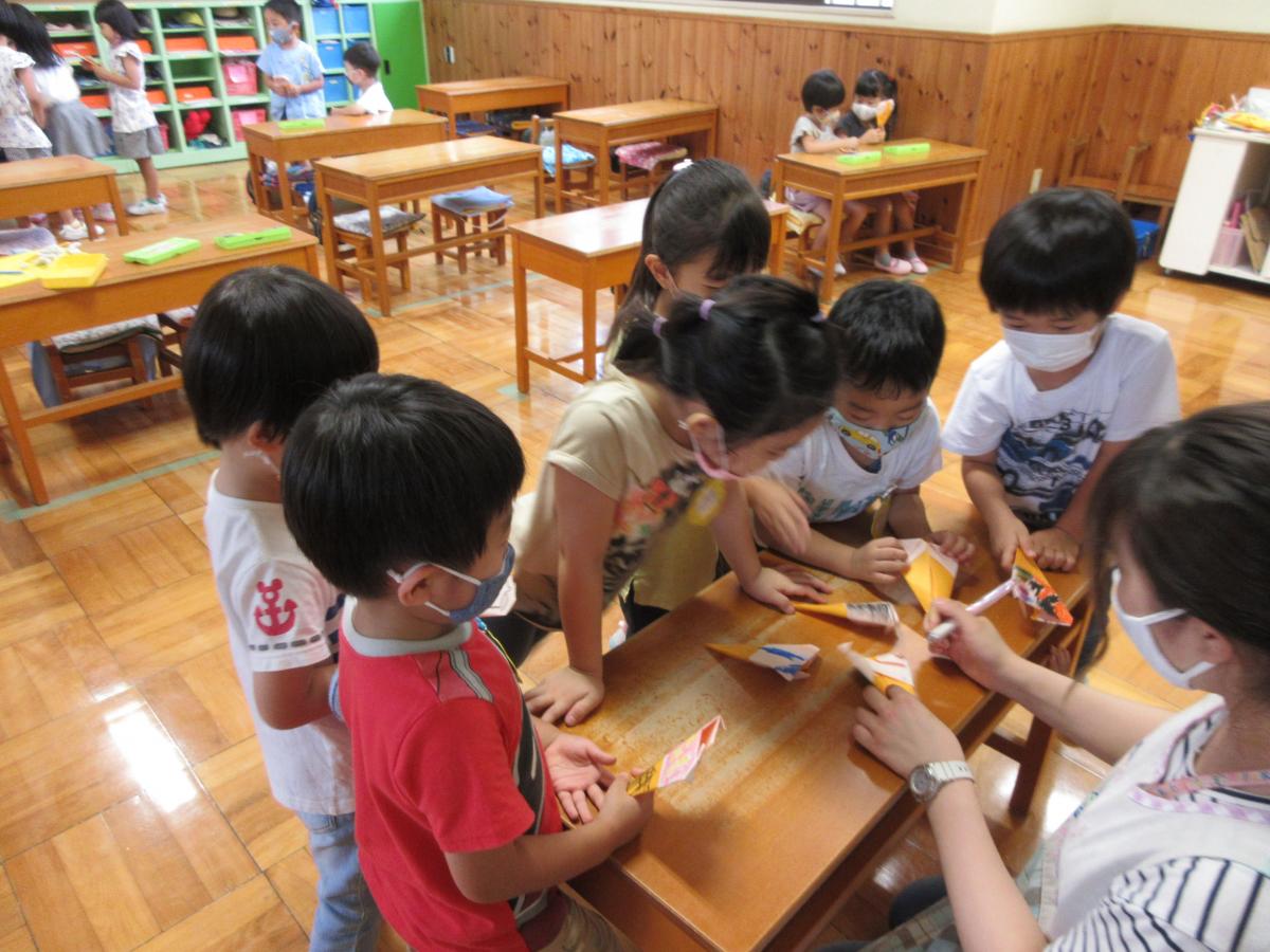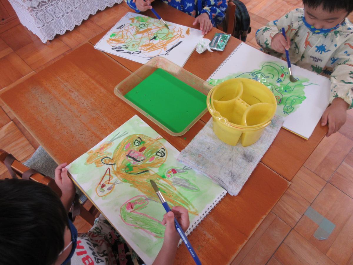 製作活動~年中~ みんなで折り紙!真剣に取り組む子どもたちです。なにができるかな? アイスクリームのできあがり!「せんせい、これはちょこだよ!」など嬉しそうに話していました! はじき絵!クレヨンで描いたおばけが浮き上がってきました!!