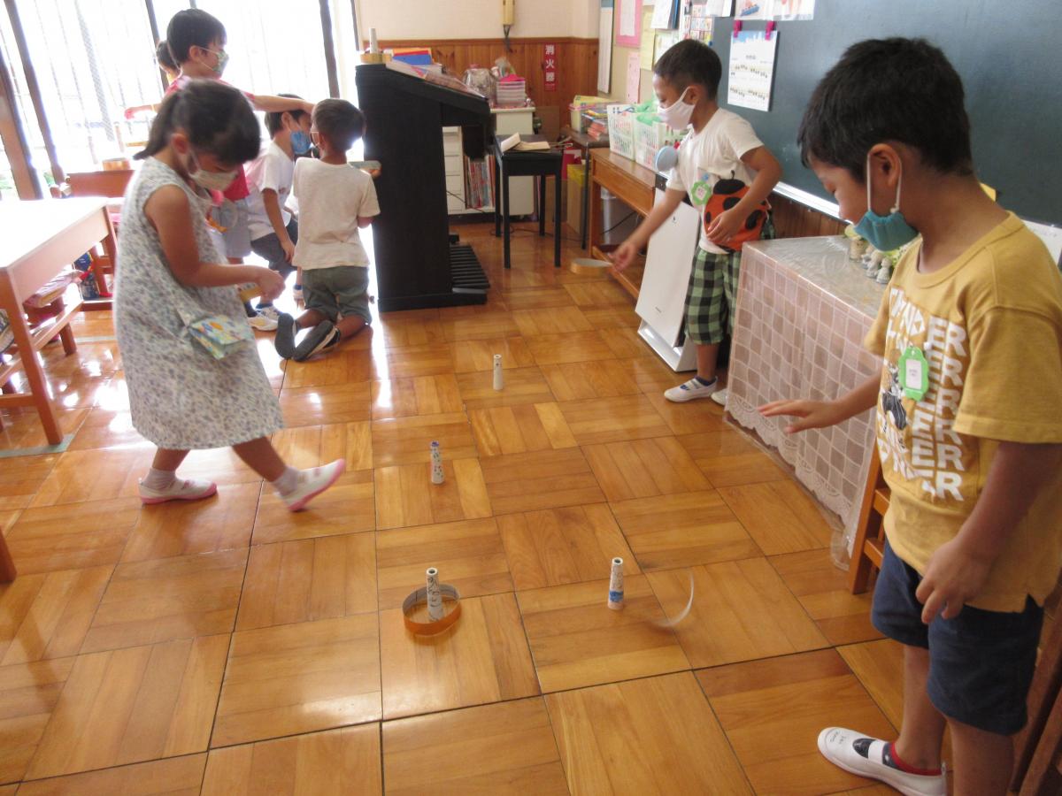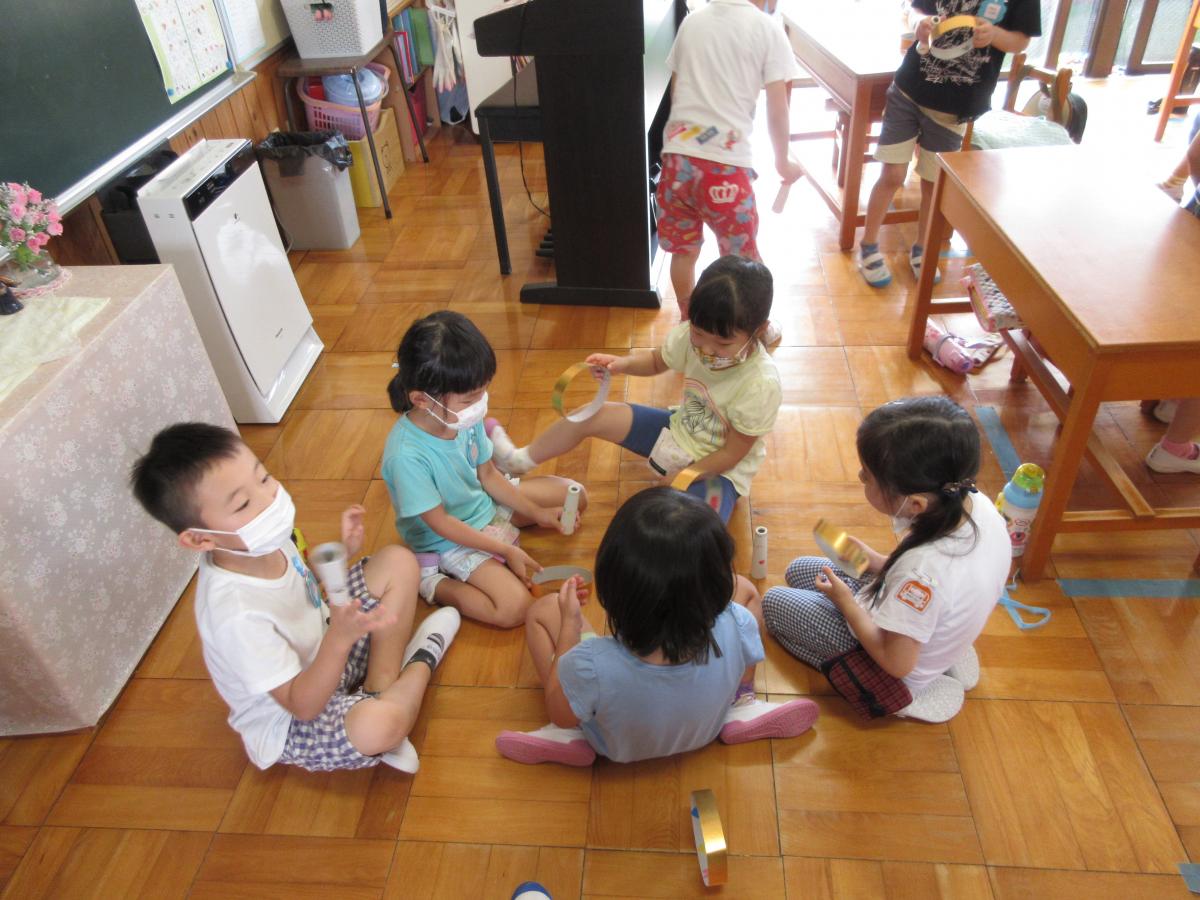 製作活動~年長~ 輪になる画用紙に模様を描いてオリジナル輪投げを作りました! 作ったらさっそく遊んでみました!上手にはいるかな!? 遊んでいくうちにいろいろな遊び方を見つけて、お友だちと楽しんでいました!