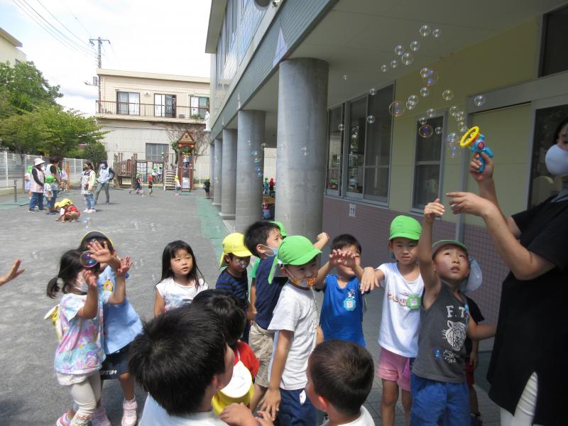 しゃぼん玉あそび 風にのって空高くあがったり、いろんな方向に飛んでいったり しゃぼん玉の動きをみて、楽しそうに追いかけて遊ぶ姿が印象的でした! こんなにたくさんのしゃぼんだま玉がでてくるとワクワクしちゃうね!!
