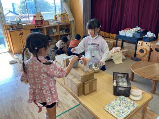月日が経つのは早いもので、今年も残りわずかになりましたね。街はクリスマスの装飾で華やぎ、寒さも少しずつ厳しくなってきましたが、子どもたちはお外遊びが大好きです♡全身を使って元気いっぱいに遊ぶことも多いですが、お外でもごっこ遊びが盛んなももぐみさん。三輪車を車に見立てたり、葉っぱをキャベツに、小石をお金やポテト、ポップコーンなどに見立てたりしながら、三輪車に乗ってやってくるお友だちとやりとりを楽しむ姿が見られました。子どもたちの経験から、自然と遊びが広がっていったのですね!!!!