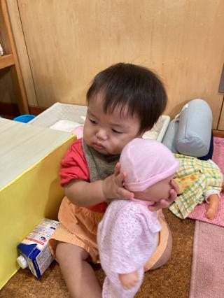 朝夕の風が心地よく、日中も過ごしやすい季節となり、園庭やテラスにも爽やかな秋の空気が広がっています。澄んだ空や揺れる木々の葉に季節の移ろいを感じる頃となりました。歩けるようになってきた子どもは靴を履いて園庭で遊ぶようになりました。ハイハイやつかまり立ちをしている子どもはテラスに出て風を感じながら、周囲の景色や音を感じて過ごしています。室内では一人ひとりが興味を持った玩具に手を伸ばしたり、周りの様子をじっと観察しながら遊んだりする姿が見られ、子どもたちの成長や遊びの広がりが感じられるようになってきました。