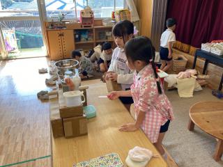 過ごしやすい気候となり、戸外遊びを楽しみにする姿が多く見られるようになった子どもたち。園庭では、うんていや鉄棒、吊り橋などを使って全身を動かして遊んだり、しっぽ取りだけでなく、増え鬼や代わり鬼、転がしドッジなど、ルールのある色々な遊びを友だちと一緒に楽しんでいます。また、園庭に落ちている葉っぱや木の枝、木の実などを拾って、砂場に持って行き、ケーキの飾りに見立てて遊ぶなど、お店屋さんごっこをする姿も見られますよ。これからも秋の季節を感じながら全身を使って楽しんでいきたいと思います。
