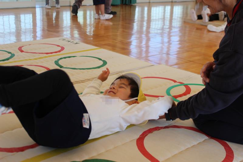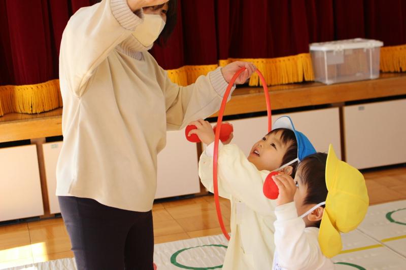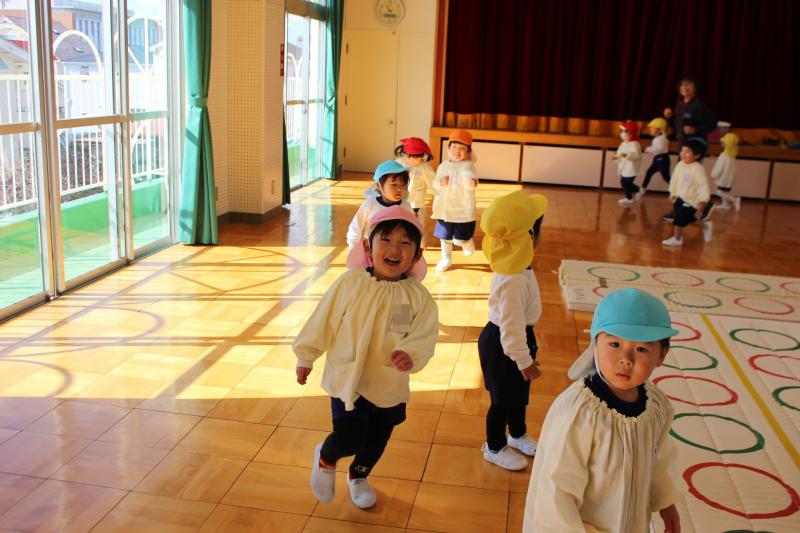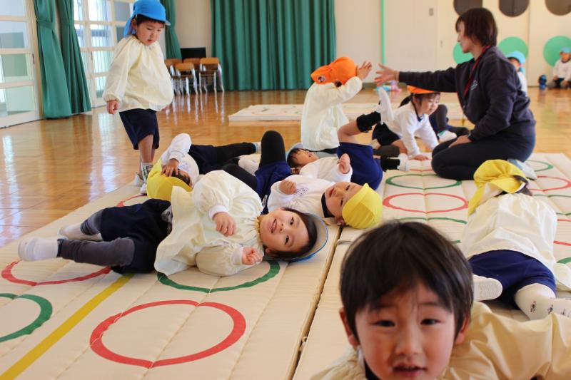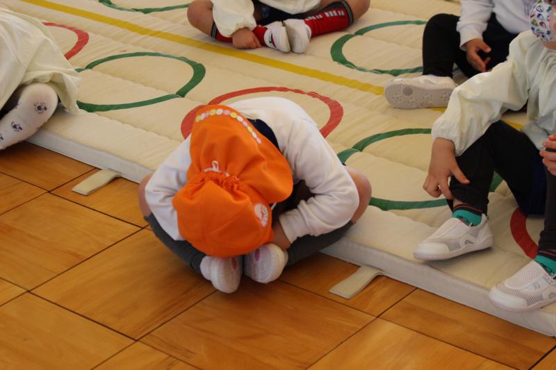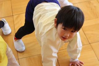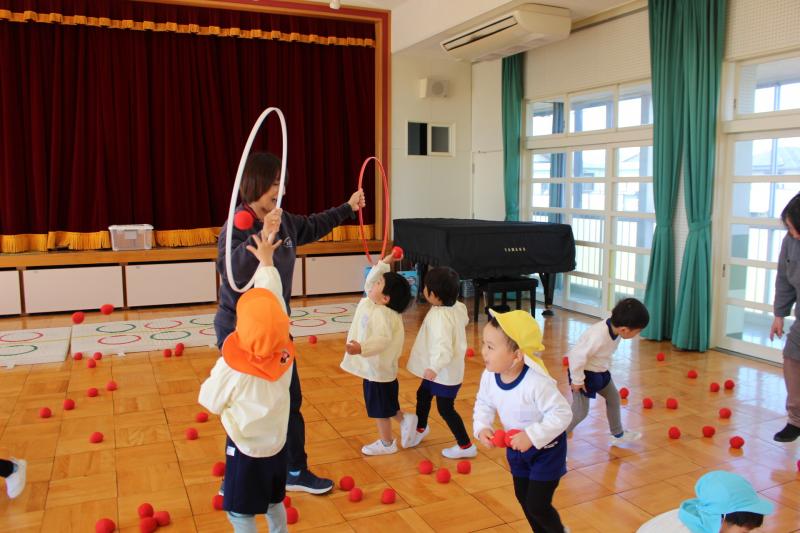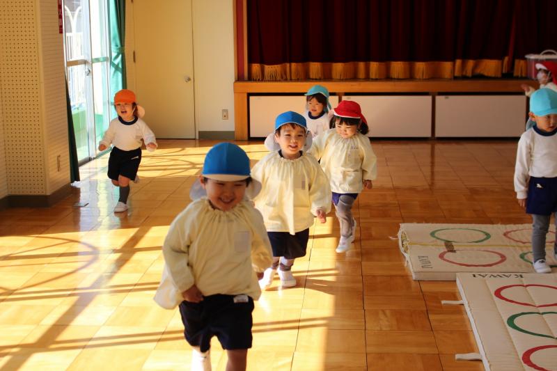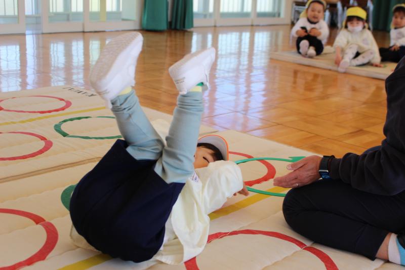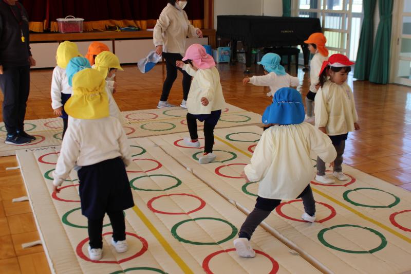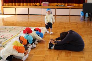 ホーム 満3歳児(Dさん)の体育レッスンがありました! 満3歳児(Dさん)の体育レッスンがありました! 2025年02月04日 今日は、満3歳児13名で体育レッスンに参加しました。新しいお友達も増え元気いっぱいのDさん!今回は遊戯室で行ったため、思いっきり走ることができ楽しそうでした。ハイハイからライオン歩き、その後は前転を頑張りました。補助なしでやりたい子もいて経験があるんだな!と思いました。お布団の上で練習するのもいいですね!最後は玉入れの玉を投げる活動をしました。上に投げ上げることが全くできない子もいたので、また活動の中に取り入れていきたいと思いました。楽しかったね(*^▽^*)