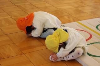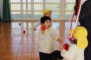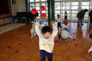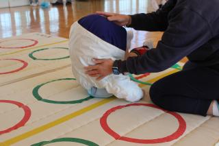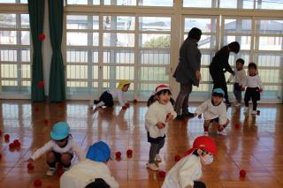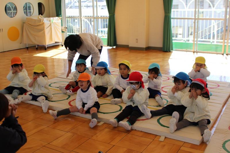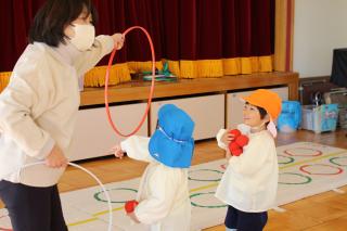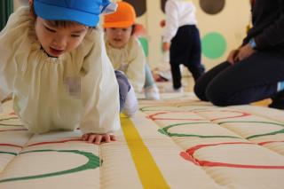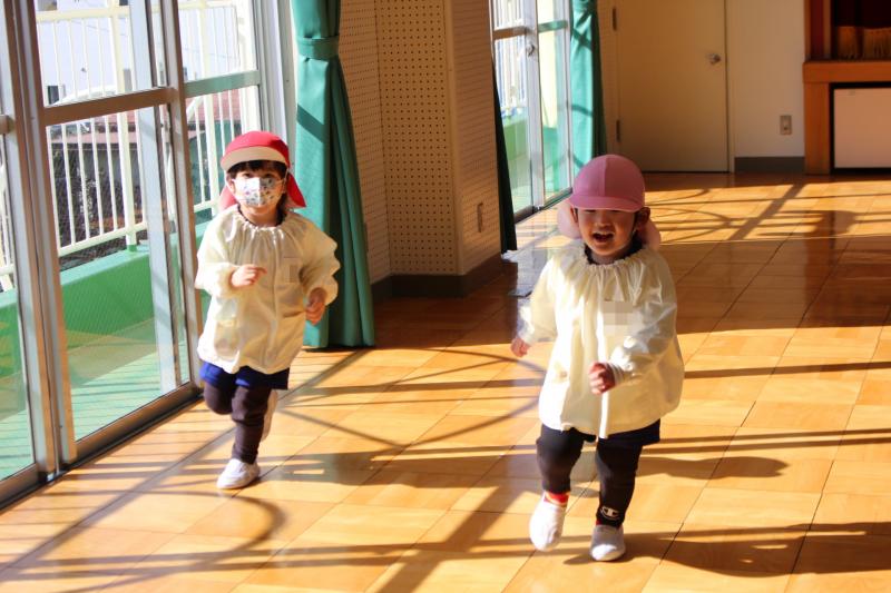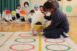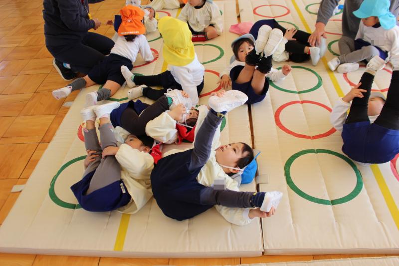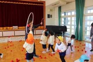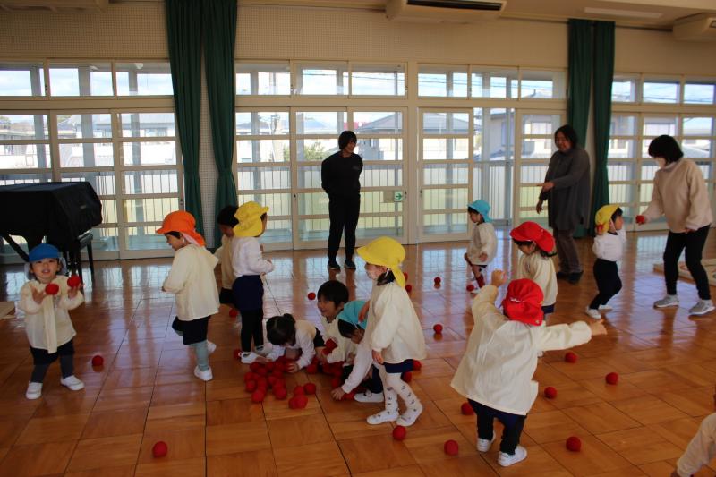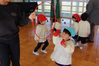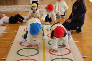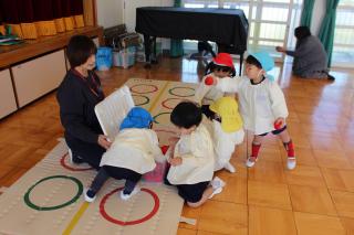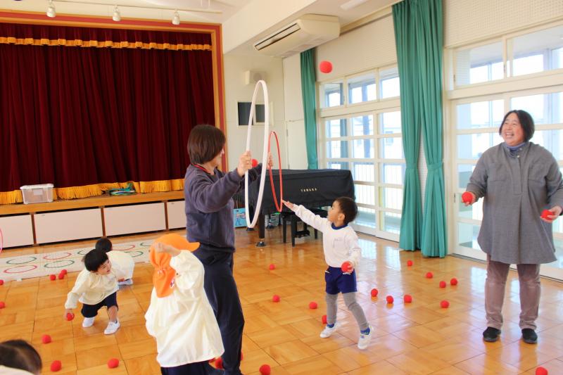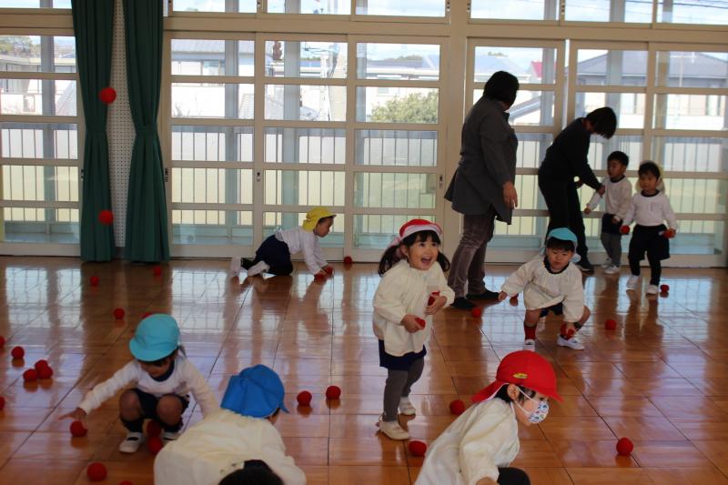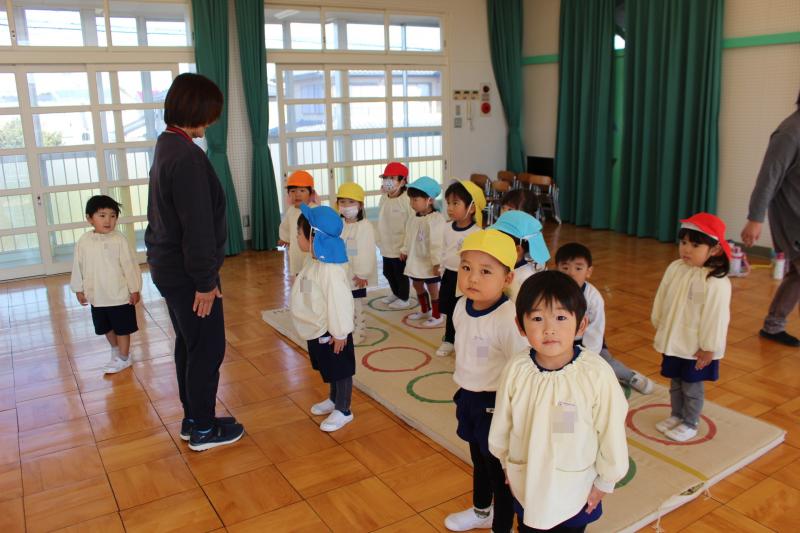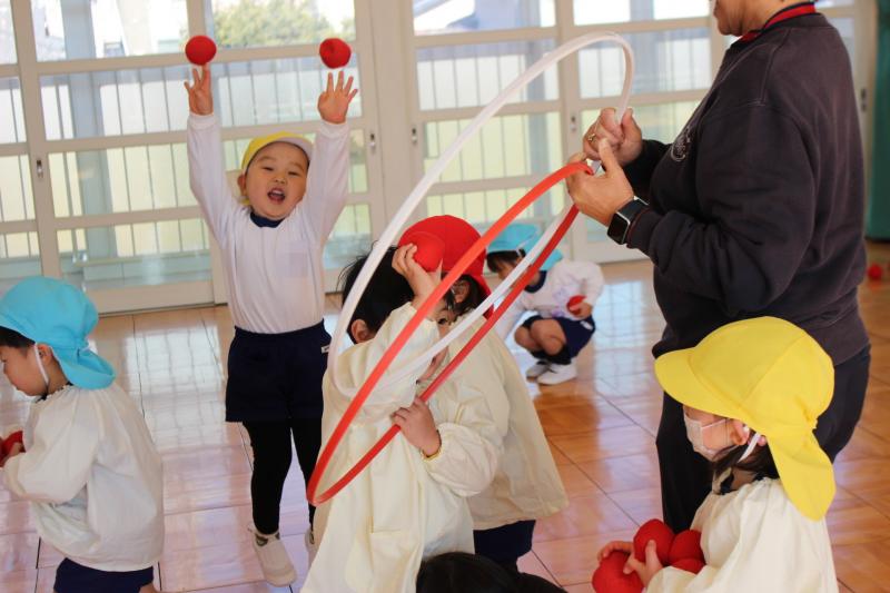 ホーム 満3歳児(Dさん)の体育レッスンがありました! 満3歳児(Dさん)の体育レッスンがありました! 2025年02月04日 今日は、満3歳児13名で体育レッスンに参加しました。新しいお友達も増え元気いっぱいのDさん!今回は遊戯室で行ったため、思いっきり走ることができ楽しそうでした。ハイハイからライオン歩き、その後は前転を頑張りました。補助なしでやりたい子もいて経験があるんだな!と思いました。お布団の上で練習するのもいいですね!最後は玉入れの玉を投げる活動をしました。上に投げ上げることが全くできない子もいたので、また活動の中に取り入れていきたいと思いました。楽しかったね(*^▽^*)